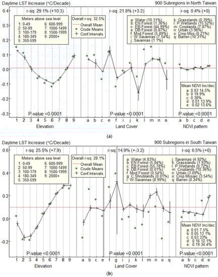 In the South region, daytime LST increase at elevations less than 600 m above sea level was significantly lower than average, while LST increase at elevations greater than 600 m was significantly higher than average. At elevations of 350 m or higher, there was an increasing trend of daytime LST. For the LC, areas with mixed forest, closed shrubland, cropland, and urban parts had significantly higher daytime LST increases than the average, while the other types of LC had significantly lower daytime LST increases than the mean. For the vegetation index, the increasing trend of daytime LST increase was found at high vegetation patterns, which were higher than the average of daytime LST increase.