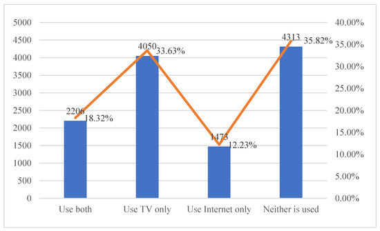 A further television and Internet use analysis is shown in Figure 1. A total of 2206 samples, or 18.32%, used both television and the Internet to receive news; the number of samples using only television or the Internet was 4050 and 1473, respectively; 4313 samples, or 35.82%, used neither television nor the Internet.