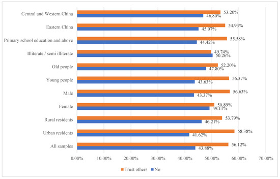As seen in Figure 2, the results showed that 6477 residents (53.79%) trusted others, and 5565 (46.21%) felt that others could not be trusted. Further, 7296 (58.56%) urban residents trusted others, which was higher than rural residents (53.79%); statistically speaking, urban residents trusted others more than rural residents [73]. The percentage of trust in others among rural residents was 5.74% higher in men than women, significantly higher in young people than that of middle-aged and elderly people, higher in people with elementary school education or above than that of illiterate/semi-literate people, and similar among people in eastern, central, and western regions. The percentage of trust and distrust in others among women and illiterate/semi-literate people were basically equal.
