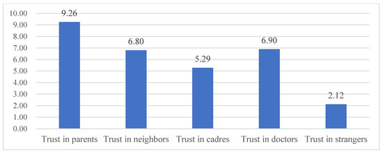 As Chinese people’s trust is based on a community of blood relations, rural residents showed an ordered pattern of affinity in social trust [13]. In order to study the social trust characteristics of rural residents, a descriptive analysis of rural residents’ trust in different groups of people was conducted. As can be seen from Figure 3, the most trusted group of rural residents was parents, followed by doctors, neighbors, and cadres, and the least trusted was strangers.