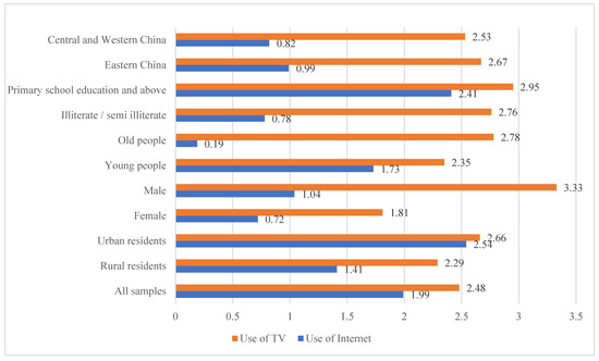 As seen in Figure 4, urban residents used the Internet and television an average of 1.13 and 0.37 days more per week than rural residents, intuitively indicating that urban residents used television and the Internet more frequently than rural residents to obtain news and information. The 19.27% difference between the sample of urban and rural residents who did not use the Internet as extremely likely due to the poor communication and network facilities in rural areas, which are more difficult for rural residents to access; the value of 17.61% of the sample of rural residents who used the Internet frequently (more than 4 days per week) was lower than the value of 33.09% of the sample of urban residents. The label of information-disadvantaged can be clearly seen in the comparison of populations among rural residents, mainly women, illiterate/semi-literate, and elderly, who used the Internet and TV to access information significantly less frequently than men, highly educated, and young people. There was little difference in the frequency of Internet and TV use between rural residents in the eastern region and those in the central and western regions.