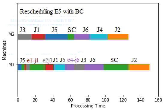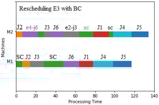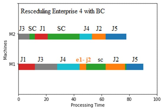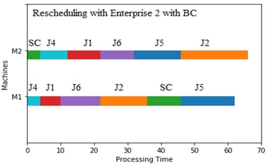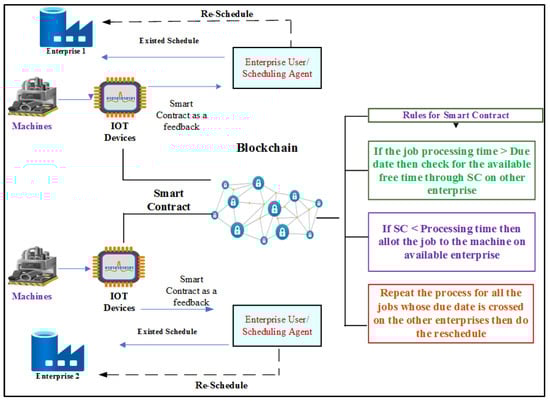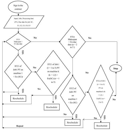 On carefully checking Table 2, job 3 at enterprise 2 has a DD of 75, but it has already passed the DD in the schedule. In such cases, the IOT device installed on machine 2 of enterprise 2 starts searching for a suitable smart contract that has free time in other enterprises (E1, E3, E4, and E5) for the same machine 2. The smart contract runs with a logic that is expressed in Figure 4. After the execution of the smart contract, the processing time of job 2 on the machine is less than the free time SC for enterprise 3. Immediately rescheduling is implemented to E3, a change marked as E2–J3 on E3 after the rescheduling. It does not affect the makespan of the pre-existing jobs at E3.
