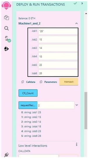 Figure 6 and Figure 7 are ways for people to see and interact with this smart contract, where they can view details such as task numbers, due dates, and resource allocation. The two show smart contracts created for different enterprises. Each contract may have specific parameters that are relevant to the enterprise, such as the number of machines, tasks, and their respective due dates. These parameters can then be used by the smart contract to automate processes such as scheduling and allocation of resources within the enterprise. Smart contracts can also be programmed to automate other processes within the enterprise depending on the specific needs and requirements of the enterprise.
