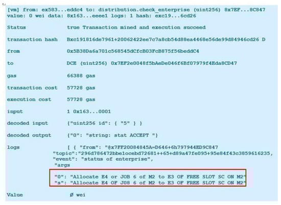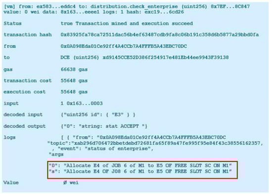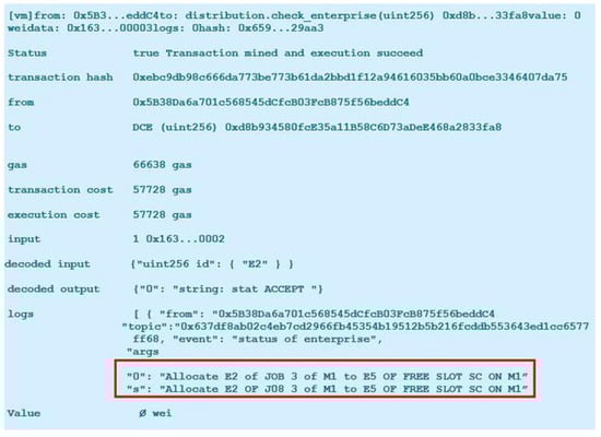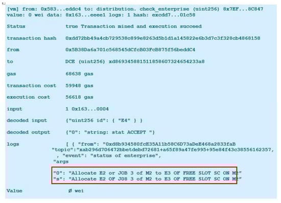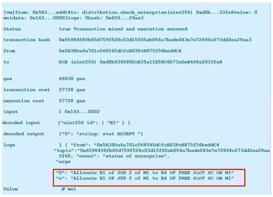 Figure 8 clearly shows that after the execution of a smart contract, job 2 for enterprise 1, which crossed the due date, was allocated to enterprise 4 when there was free time available at enterprise 4 on machine 1. Similarly, the blockchain transactions for all the five cases are shown in Figure 8, Figure 9, Figure 10, Figure 11 and Figure 12. In Figure 9, job 3 that belongs to E2 has crossed its due date and been allocated to enterprise 5 when there is free time available on machine 1.