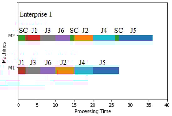 Figure 13, Figure 14, Figure 15, Figure 16 and Figure 17 show the initial schedules of all jobs on the machines of each enterprise. Figure 13 shows the schedule of all the jobs on the machines for enterprise 1. The makespan of all the jobs in this case is 36. Red indicates job 1, yellow indicates job 2, grey indicates job 3, cyan indicates job 4, blue indicates job 5, and green indicates the smart contract, i.e., free time on the machines.