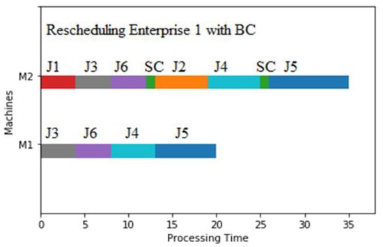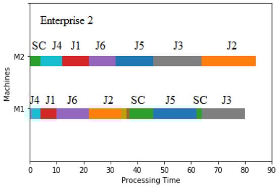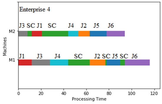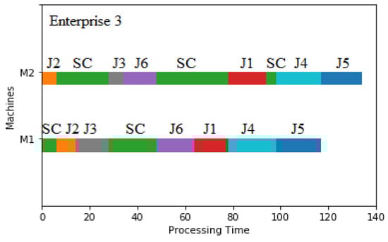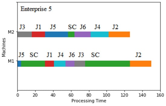 Each enterprise has two machines. They have the ability to handle tasks or actions assigned to them since the system under consideration is by its nature a DMS. Enterprises (E1, E2, E3, E4, and E5) have the advantage of sharing tasks or activities when needed. Here in this scenario looking at five jobs that should be processed in each organization with two available machines. Initially, planning is carried out according to the Jackson model [10,11], or in case of manufacturing environments with three or more machines, an extended version of this model can be used [11]. Moreover, the proposed scheduling approach can be further used in combination with other techniques for solving management problems occurring in networked environments, often by using approaches based on social network analysis (SNA) [62]. Other approaches, for instance, include the application of diverse kinds of multi-criteria decision-making methods, along with varying kinds of data normalization techniques [63]. These kinds of approaches, among a range of others, play a crucial role currently in Industry 4.0 [64].