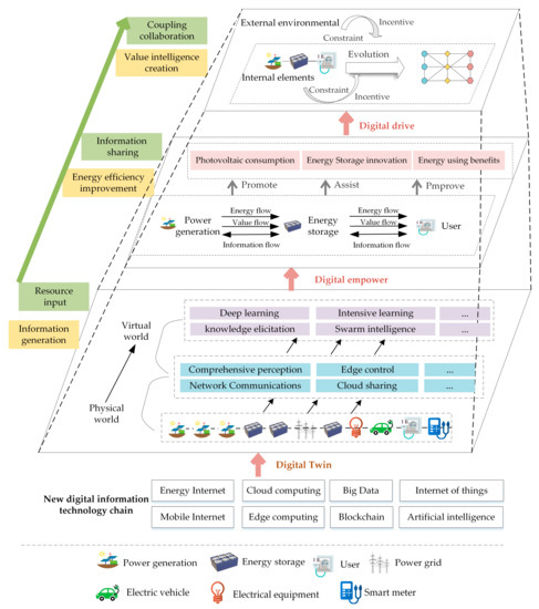 This can effectively promote photovoltaic consumption and innovation in energy storage and benefit the emergence of energy use among the subjects of the “power genera-tor–storage–use” value chain. Digital technologies can help to achieve transformation and upgrading of “informatization, digitization and intelligence” of the value chain. The agents of the value chain become the energy information resources agents, which are relevant and influenced by each other, to realize value intelligence creation.