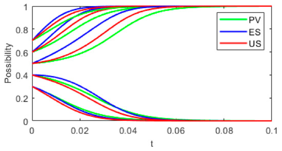 In terms of behavior selection and collaboration strategy among relevant stakeholders in the photovoltaic–storage–use value chain, a three-party evolution game model is established by Chen et al., in which incentive policies of distributed photovoltaic systems and the actual industry situation are used for numerical simulation. The influence of initial willingness, financial subsidy, penalty tax, operating efficiency, additional cost and investment cost on participant behavior was analyzed [43]. Based on a variety of initial conditions of different regions, Zhang et al. explored the evolutionary process of electricity market players considering energy storage technology, and adopted a three-party evolutionary game model to analyze the strategies of the power plant, the power grid and the government [44]. Sun et al. established a dynamic evolutionary model of different types of users choosing retailers based on the logit revision protocol, considering characteristics of different types of users and interruptible loads as well as users’ distributed renewable energy [45].