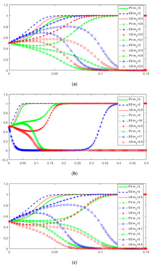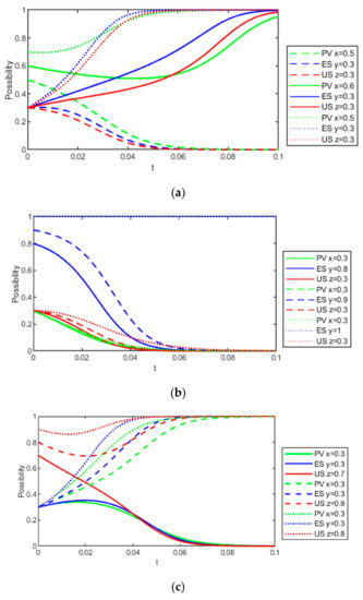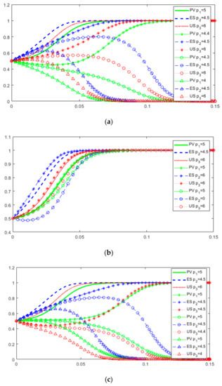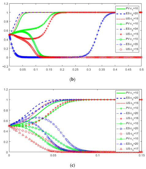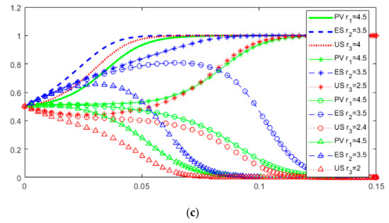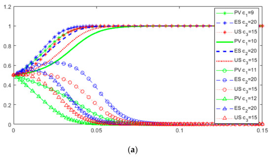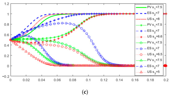 Assume that the initial x, y and z are all 0.5, and take different values for . The evolution results are shown in Figure 9. As shown in Figure 9a, the threshold of is between 3.8 and 3.9. When is lower than the threshold, the stable strategy of three-party collaboration evolution tends to (0,0,0), and the more minor is, the faster the three parties converge to 0. When is higher than the threshold, the stable strategy tends to (1,1,1), and the larger is, the faster the three parties converge to (1,1,1). As can be seen from Figure 9b, when , the stability points are (1,1,1), and the larger is, the faster the convergence speed. Similarly, Figure 9c shows that the threshold value of is between 2.4 and 2.5. Figure 9 shows that y converges to 1 faster in most cases. The results show that (1) the larger the enabling efficiency coefficient is, the stronger the willingness of PV, ES and US’s selection of the digital-driven strategy for value chain collaboration is, and the faster the speed of convergence to the stable state. This is due to the increasingly advanced information technology in the context of the digital economy, which has greater power to drive the digital transformation of energy and digital utility of the value chain, and greater encouragement for stakeholders to carry out collaborative decision making. (2) PV and US are sensitive to the enabling benefit coefficient, because they have more input in information resource elements. (3) Even when the ES is under the condition of small enabling benefit coefficient, it will evolve to choose the digital-driven strategy. Because ES can profit from the large amount of information resources invested by the PV and US, it has a stronger willingness to collaborate.