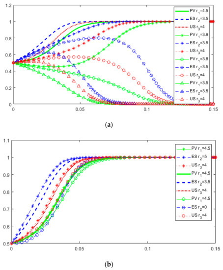 If , at this time ; no matter what value x takes, the strategy selection of PV is in a stable state and will not change with time, as shown in Figure 3a.