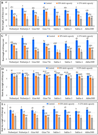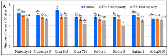 Morphological and physiochemical parameters were recorded under normal irrigation and drought conditions with all studied cultivars to study the effect of drought treatments on the performance of cultivars compared to the normal irrigation regime. The averages of the studied traits for the studied cultivars over the morphological and proline content are presented in Figure 1. Overall, in the studied cultivars, significant differences were presented between the control, 50% field capacity, and 25% field capacity (Table 2). The Giza 843 cultivar showed the highest number of leaves at 30 days under the normal irrigation regime, while Akba 3300 showed the lowest number of leaves at 30 days under the same conditions. Under 50% field capacity, all cultivars presented a moderate reduction in the number of leaves. In the case of 25% field capacity, all cultivars showed no significant differences with 50% field capacity in the number of leaves at 30 days except the Giza 716 and Sakha 3 cultivars (Figure 1A). Clear significant differences appeared among all studied treatments for the length of shoots and the length of roots at 60 days, the dry weight of shoot (g), and the dry weight of root (Figure 1B–F). The relative mean decrease was found in most parameters with decreased field capacity except with proline content (Figure 1F).