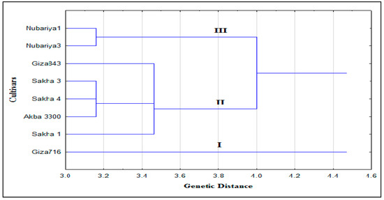 The phylogeny analysis of the combined SCoT and SRAP-PCR banding profiles grouped the eight cultivars into three main clusters. Giza 716 formed an independent cluster (Ι). The second cluster included Sakha 1, Sakha 3, Sakha 4, and Akba 3300. The third cluster consisted of two cultivars, Nubariya 1 and Nubariya 3 (Figure 3).