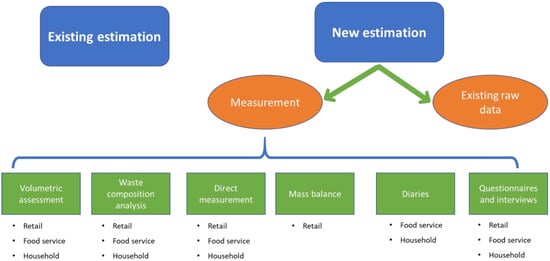 A product supply chain analysis can help to define the system’s boundaries (including geographical boundaries), the main product flows, and the actors involved in it, including their activities (e.g., sorting, grading, transportation, storage, etc.), which can result in different waste levels. Once the actors in the urban supply chain are defined, FW flows at each level and their drivers should be inferred. A recent example of a mapping approach is the EFFICIENT protocol [43]. Quantifying and measuring waste levels is one of the hardest challenges regarding FW. In the literature, a broad range of methodologies—each with its own advantages and disadvantages—has been developed [6,43,44,45,46,47]. A summary of the most commonly used methods is presented in Figure 2 [6,48].