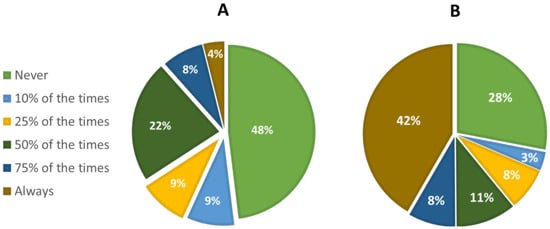 The questionnaire collected information on the shopping habits of the respondents. Most participants reported purchasing their food from small shops (90%), street vendors (88%) and markets (56%). Regarding the frequency of food shopping, 66% of the participants reported going for food purchase two times per day, 8% once every three days, 7% once per day, 6% once every two days and only 4% once per week. The habit (or necessity) to obtain food everyday may be an indication of food insecurity and may negatively influence shopping planning. Indeed, almost 50% of respondents indicated that they never plan what to buy when going food shopping, while only 4% indicated that they always plan what to buy (Figure 3A). Similarly, the survey highlighted that participants do not usually plan meals in advance, with 57% of the participants reporting that they never plan their meals at home and only 5% of the participants often (75% of the time) plan their meals. However, the survey did find that Kibera’s inhabitants often check their supplies before going to purchase food (Figure 3B).