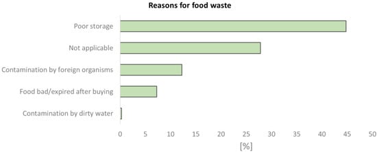 Figure 4 summarizes the main reasons behind the FW generation. While 28% of the participants (n = 207) did not report any FW at the household level, the remaining ones (72%, n = 480) reported that this occurred mainly due to food going stale because of poor storage (45%, n = 333) and to spoilage/contamination (12%, n = 91). Contamination by dirty water does not seem to be a relevant reason for FW, and only in a few cases was food noticed to be bad or expired just after purchase (7%, n = 54). According to many participants, high weather temperatures also played a role in spoiling food. In terms of food categories, participants indicated that the products that were wasted most were maize-based products (including flour, whole grain, green maize, ugali, githeri and uji) and perishable products like vegetables, fruits and milk-based products.