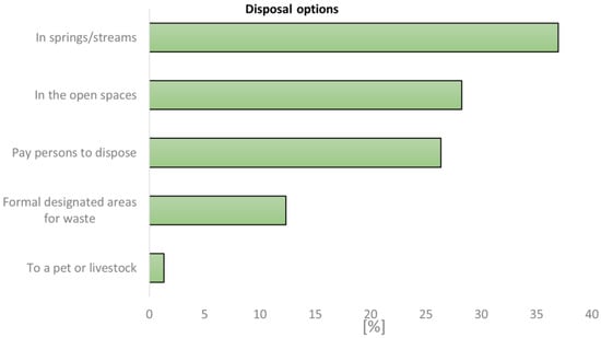 Participants were asked about both MSW disposal and, more specifically, FW disposal. Since similar answers were recorded, only data about MSW are shown. The main waste disposal places in Kibera resulted to be the springs/streams (37%, n = 275) and/or in open spaces around Kibera (28%, n = 210) while 26% reported to pay a person to dispose of their MSW and/or dispose of their waste in formal designated areas (13%, n = 92) (Figure 5). Only 1% of the participants used their MSW for feeding livestock (mainly chickens). Other options that were mentioned were burning the non-decomposing waste, such as plastic bags, while the kitchen waste was also used for composting.