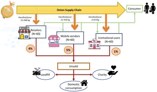Onions are a popular product in Bangladesh, with a total production in 2017–2018 of 1738 million tons and a production that keeps increasing [65]. Table 2 and Figure 6 show the main results regarding the amounts of handled onions, what percentages are left unsold, and the destinations of these unsold onions at retailers, mobile vendors and institutional users.