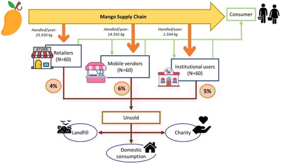 To summarize, most unsold mangoes were found at the end of the supply chain at retailers, mobile vendors (5.7%) and institutional users. Similar findings were reported in previous research [69]. During the handling process, losses occurred mainly due to peeling and the removal of spoiled parts, while during storage, losses were reported due to an improper storage facility or rot development in bad-quality mangoes. These losses can be due to sub-optimal packaging, transportation that can damage the fruits, exposure to high temperatures and, in general, poor quality of the purchased mangoes. Losses due to bad quality are caused by a lack of proper handling, sorting and storage earlier in the supply chain, including harvesting activities.