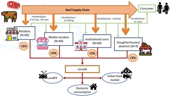 The study analyzed four beef food system actors: retailers, mobile vendors, institutional users (which include restaurants and hotels) and abattoirs. Inside the supply chain, every actor increases the product’s value by performing different activities, including handling and storage. An additional level of complexity is introduced since both live cattle and meat are traded, often by the same actors. Table 4 and Figure 8 show the main results regarding the amounts of beef and live cattle that are being handled, what percentages are left unsold, and the destinations of the unsold meat for each actor.