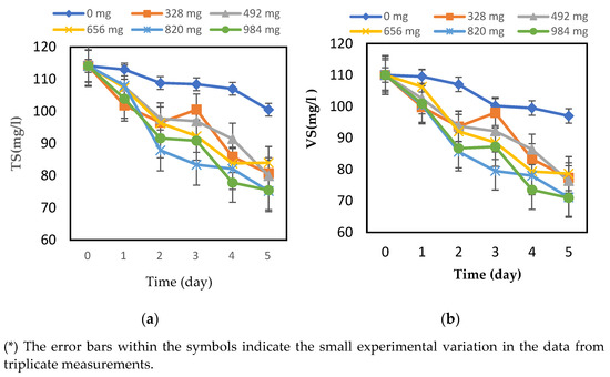 The efficiency of the hydrolysis process was assessed by measuring and comparing the total COD and soluble COD over time, as well as the TSs, TVSs, and dissolved solids (TDSs). Time is another important parameter for hydrolysis, which represents the period in which the collected FW with immobilized biofilm has been hydrolyzed. The effect of biofilm amount was studied to find out the optimum amount of biofilm and the optimum time that can give the best conditions for hydrolysis of the collected food waste. For that, the following amounts of biofilm were attached to different masses on the GAC were used: 328 mg, 492 mg, 656 mg, 820 mg, and 984 mg of biofilm. For each gram of GAC, the TSs and VSs were measured every day for five days, and the changes are represented in Figure 1a,b, respectively.