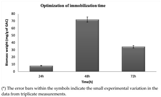 The cell biomass adhered to the GAC was measured to quantify the total solids (TSs) to ensure that all bacteria grown on the surface were removed and to measure the biofilm attached to the surface (Figure 2). From the changes in the TS content, which is the biomass weight measurement, the considered shaking times (24 h, 48 h, and 72 h) have different amounts of biofilm attached to the GAC. A total of 10 mgg−1 of biofilm was attached after shaking the immobilization solution for 24 h; 72 mg/g of biofilm was immobilized on the GAC carrier after 48 h; 38 mgg−1 of biomass was formed after 72 h of shaking. According to Jamali et al. [31], the biomass weight differences are due to the mechanical stability of the biofilms produced on the activated carbon at different shaking times, which promotes microbial adhesion. From the time variations, at 48 h of incubation, there was a significant increase in the weight of the biomass produced, from 10 mgg−1 of GAC to 72 mg/g of GAC. A high peak is observed, representing a high number of bacteria attached to the GAC carrier and forming a potential biofilm. After 72 h, the weight of the biomass decreased sharply, reaching 38 mgg−1 of GAC due to the detachment of the bacteria from the GAC surface when incubated for 72 h. Based on the observations from the results, day 2 (48 h) of incubation was chosen as the best time for the immobilization of the biofilm.