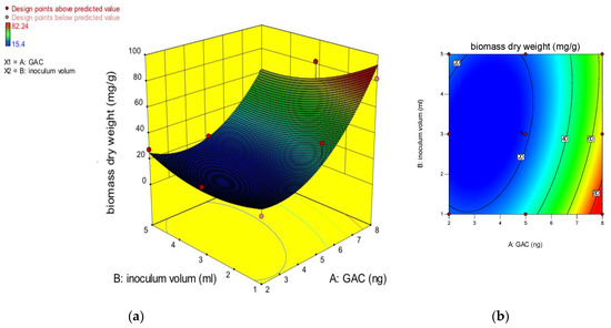 3D response surface curve (a) and contour plot of the interaction (b) effect between inoculum volumes and GAC masses.