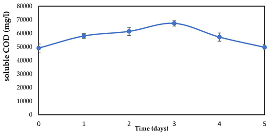 For a more detailed explanation of the digestion of organic compounds in a biological pretreatment, it has also become crucial to assess the soluble COD. As a result, the soluble COD was evaluated, and Figure 6 shows the variations. The data show that the SCOD increased with time, including in the control (hydrolyzed without an immobilized biofilm), indicating that the solubilization was not specifically related to the pretreatment. In terms of hydrolysis time, day 3 had the most solubilized organic waste. The highest degradation of organic matter corresponds to the highest soluble portion of the COD, according to Donoso-Bravo et al. [50]. From day 0 to day 3, the soluble COD increased, and from day 3 to day 5, it significantly dropped. The SCOD change graph makes it obvious that day three is the best day to hydrolyze food waste and that the prolonged hydrolysis time may have been caused by the high polymer and organic matter contents of the collected food waste. It is important to note that the rate of organic compound decomposition increases as the COD becomes more soluble and the TCOD decreases.