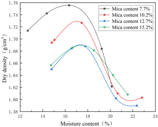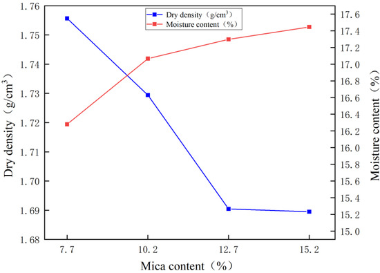 - The density of the mica was lower than that of the loess. With the increase in the mica content, the maximum dry density of the loess with different mica contents decreased gradually, while the optimal water content showed an upward trend. After the maximum dry density was reached, the water content had a greater impact on the dry density.