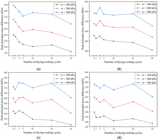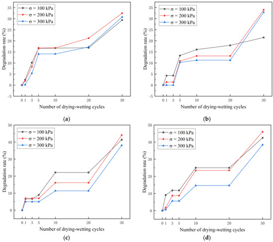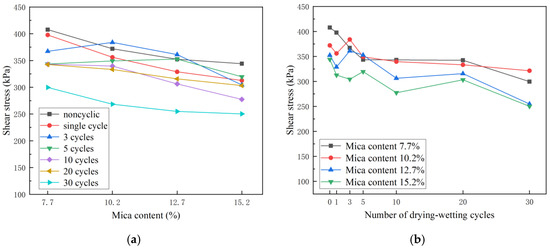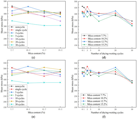 - Under the same FTCs and confining pressure, the shear strength decreased and the degree of the deterioration of the soil strength increased with the increase in the mica content. Under the same mica content and confining pressure, although the shear strength fluctuated, it showed an overall downward trend. The shear strength increased with the confining pressure.