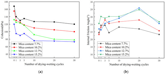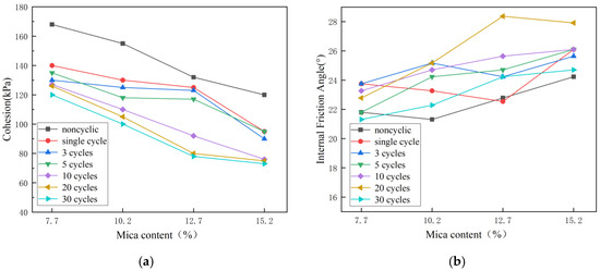 - When the amount of mica in the soil increased, the cohesiveness of the soil dramatically decreased; however, the internal friction angle changed with an increasing trend under the same FTCs conditions. The internal friction angle increased initially, under varying mica contents, before decreasing, and the soil cohesiveness reduced as the number of FTCs grew.