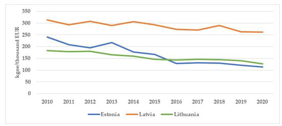 Energy intensity in manufacturing in the Baltic States from 2010–2020 (own estimations based on [49,50,51,52,53,54]).