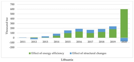 Figure 3 shows that energy savings have increased due to annual improvements in energy intensity in manufacturing. During a decade, 2.28 Mtoe of energy was saved in manufacturing in Estonia, followed by 1.57 Mtoe in Lithuania, and 1.27 Mtoe in Latvia. EE was a key driver of total energy savings. It was responsible for 91.1% of total energy savings in Estonia and for 82.7% in Lithuania. The contribution of structural changes in activities to total energy savings in these countries was 8.9% and 17.3%, respectively. In Latvia, structural change in activities was a driving force that reduced energy savings by 1.3 Mtoe over the study period due to an increase in the share of the two most energy-intensive industries in energy consumption.