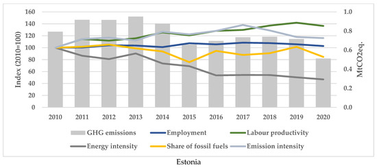 As shown in Figure 4, reductions in GHG emissions were supported by improvements in energy intensity and reductions in the share of fossil fuels but they were diminished by increases in labour productivity, emissions intensity, and employment. Over the period 2010–2020, energy intensity was improved by 53.2% in Estonia, 30.5% in Lithuania, and only 16.5% in Latvia. Owing to integration of renewable energy technologies, the share of fossil fuels decreased by almost three times in Latvia. The decreases in the share of fossil fuels remained small in Lithuania (by 17.6%) and Estonia (by 15.4%). At the end of the study period, fossil fuels accounted for 39.8% in the fuel consumption structure in Lithuania and to 33.9% in Estonia, while 17.2% was achieved in the Latvian manufacturing sector. The peculiarity of Latvian manufacturing is the consumption of fossil fuels, which has the highest and each year the most increasing emissions intensity among the Baltic countries. In comparison, Lithuania continued to have both the lowest emissions intensity and the slowest rate of growth. This allowed us to mitigate the impact of the high share of fossil fuels on GHG emissions in the country. An increase in labour productivity is a common feature in all three countries. From 2010–2020, it increased by 26.2% in Latvia, 30.5% in Lithuania, and 36.4% in Estonia. An increase in number of employees is the slowest among the key drivers. In 2020, total number of employees in Estonia was by 2.8% higher in Estonia, 7.6% higher in Latvia, and 18.5% higher in Lithuania, compared with their 2010 levels. Thus, the driver was conditionally important in Lithuanian manufacturing only.