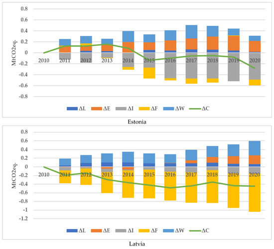 After determining the drivers that supported and diminished reductions in GHG emissions in manufacturing in the Baltic States, this section of the paper analyses the absolute changes in GHG emissions through the contribution of a single driver. The results are presented in Figure 5.