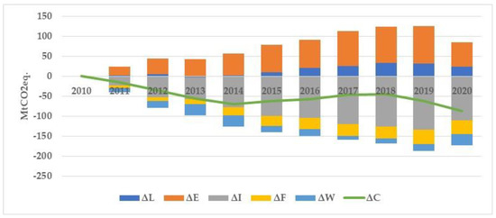 where ΔLt−0 is the effect of employees between year t and base year 0, MtCO2eq.; ΔEt−0 is the effect of labour productivity between year t and base year 0, MtCO2eq.; ΔIt−0 is the effect of energy intensity between year t and base year 0, MtCO2eq.; ΔFt−0 is the effect of reduced consumption of fossil fuels due to their substitution by RES between year t and base year 0, MtCO2eq.; and ΔWt−0 is the effect of GHG emissions intensity between year t and base year 0, MtCO2eq.