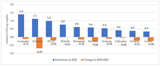 From 2010–2020, GHG emissions reduced in the Baltic States by 40.4% in Latvia, by 35.5% in Estonia, and only by 8.1% in Lithuania (Figure 4).