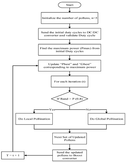 The random walk filter improves the distribution of pollens in the local and global areas, and the arrangement of solutions will reduce the gap between consecutive solutions which in turn reduces the large peaks and settling time. Further, the necessity of large time slots between consecutive solutions is no longer required. This is how the proposed order arrangement technique reduces tracking time, and increases the tracking speed and efficiency. The flowchart of the proposed technique is presented in Figure 3.