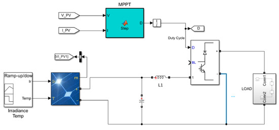 Performance analysis of the proposed technique is conducted by designing an off-grid solar PV system operating under continuously changing weather in MATLAB/Simulink. The design of a PV system is presented in Figure 4. Here, the PV array is connected to the DC–DC converter driven by the MPPT algorithm and a DC-load. The simulation of three different test cases (zero, weak, and strong partial shading) at two different standalone solar PV systems (2S and 2S2P) is conducted to validate the proposed technique at the constant and continuously changing weather conditions.