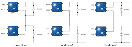 The PV system composed of two series of connected modules (2S) would experience three test conditions of zero, weak, and strong PSC as depicted in Figure 5. Each module can produce a maximum of 30 W at its MPP with 10 V and 3 A at 1000 W/m2 at 25 °C. The proposed algorithm will be compared with the conventional FPA at 2S PV system under constant and changing weather conditions at MPP tracking speed and efficiency.