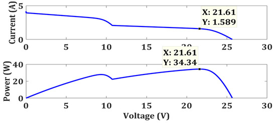 Under weak PSC, one of the two modules in the 2S-PV system is partially shaded and experiences a 500 W/m2 illumination, and the other gets 1000 W/m2 as depicted in Figure 5. This shading disturbs the 2S-PV system and creates multiple peaks in the characteristic curve as shown in Figure 7 and Figure 8. Detecting the real MPP also called the global MPP (GMPP) is a bit difficult compared to the zero shading. Here the GMPP occurs at 21.61 V, 1.589 A, and 34.34 Ws.