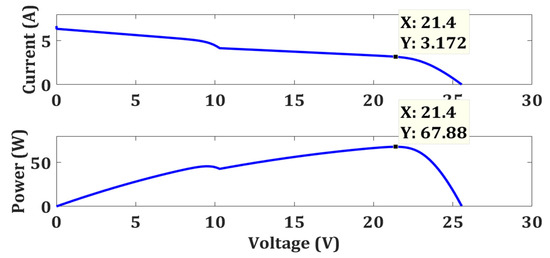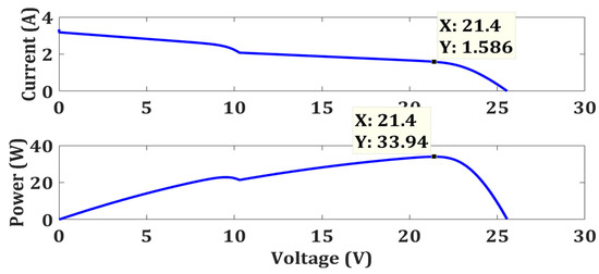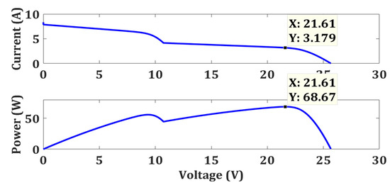 Under strong PSC, no module of the 2S-PV system receives standard illumination (1000 W/m2) due to partial shading. Each module experiences a different illumination level. In this case, the two modules are receiving 800 W/m2 and 500 W/m2 as depicted in Figure 5. Strong shading disturbs the characteristic curve as shown in Figure 8. Here the GMPP occurs at 21.4 V, 1.586 A, and 33.94 Ws.