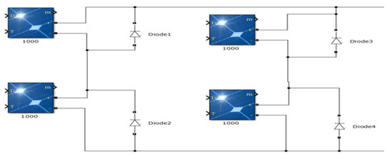 The performance evaluation of FPA and OFPA algorithms is conducted under multiple conditions at the 2S2P PV system presented in Figure 13. This system is composed of two parallel strings, each contained two series connected modules. The 2S2P experiences the same shading patterns that were previously experienced by the 2S PV system.