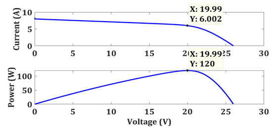The characteristic curves and the comparison of a 2S2P PV system for OFPA and FPA algorithms under zero, weak, and strong PSC are represented in Figure 14, Figure 15 and Figure 16, respectively. Under zero shading, the MPP occurs at 120 W. Under weak PSC, it reduces to 68.67 W and the characteristic curve of the 2S2P PV system is disturbed. Under strong PSC, the MPP moves to 67.88 W, and this is the worst case.