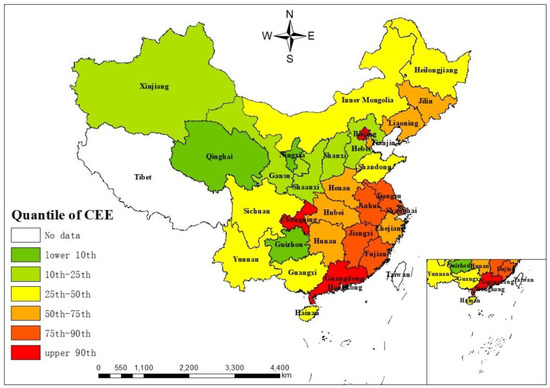 Based on Equation (6), this paper obtains the CEEs of 30 provinces in China from 2000 to 2019. The average value is only 0.172, thus indicating that the overall level of CEE is still low. Furthermore, according to the average of CEE, we choose five representative quantiles of 10%, 25%, 50%, 75%, and 90% and divide the 30 provinces into six groups (see Figure 1 and Table A2). It can be seen that roughly half of the provinces are below average, most of which are in the western region, and only Beijing, Guangdong, and Chongqing have efficiency values above the 90th quantile. From the perspective of regional distribution, provinces with higher efficiency are generally concentrated in eastern China, especially in the southeast region, and their efficiency values are significantly higher than those in the northwest region. In contrast, most northern provinces have low efficiency, especially those in the northwest, which demonstrates that there is an obvious imbalance in CEE across provinces and the spatial characteristics are very obvious.