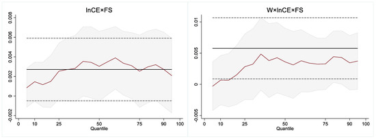 From the empirical results shown in column (1), the coefficient of lnCE is positive but not significant, while the coefficient of W×lnCE is positive and significant, thus indicating that the positive effect of clean energy on local CEE is not obvious, but neighboring clean energy development promotes local CEE. The coefficients of FS and W×FS are both positive and nonsignificant, thus indicating that the positive effect of financial structure on CEE in local and surrounding areas is not obvious. After including lnCE×FS in column (4), the original sign and significance of lnCE and FS do not change, and the interactive coefficient is positive and passes the significance test at the 10% level, thus indicating that the combination of clean energy and the financial structure can be effective in enhancing local CEE. W×lnCE×FS is also positive and significant, thus indicating that the synergistic effect of neighboring regions can enhance local CEE.