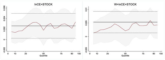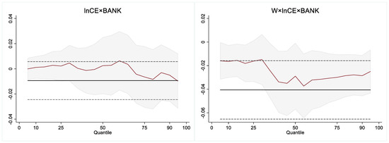 Table 3 also shows the impact of clean energy on CEE through financial markets and bank credit. In column (5), the coefficient of lnCE×STOCK is positive and passes the significance test at the 5% level, thus illustrating that clean energy can effectively promote local CEE through the stock market, which confirms H1. W×lnCE×STOCK is also positive and significant, which indicates that neighboring clean energy generation has a positive spillover effect on local CEE through financial markets. In column (6), the coefficient of lnCE×BANK is negative and nonsignificant, thus indicating that clean energy cannot enhance local CEE through bank credit, which confirms H2. Moreover, W×lnCE×BANK is negative and significant, which reveals that neighboring clean energy generation inhibits local CEE through bank credit. The spatial spillover effect of the cointegration of clean energy and financial structure on CEE is the focus of this paper. To confirm H3, we will conduct a more in-depth empirical test.
