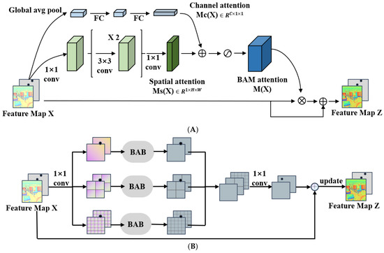 As shown in Figure 5B, we first concatenate the feature maps obtained by the feature extractor into a feature matrix in the multi-scale attention block (MSAB). Then, the feature map X is fed into three branches. Each branch divides the feature tensor into d × d sub-regions, d belongs to [1, 2, 4], and the BAB module is introduced to each branch to generate the attention of different scale features to enhance the ability to recognize fine features. After feature fusion and 1 × 1 convolution operation, a new feature map is generated. Then, the feature map and the original feature map X are added element-wise to generate an updated feature map Z. The convolution operation and nonlinear mapping in the downsampling stage extract the salient features of the changing regions. The max pooling layer is used to reduce the feature map’s resolution while increasing the feature map’s receptive field. With the increase of the number of downsampling layers, the receptive field will gradually increase, and the discriminative ability of the feature map will increase progressively; the upsampling uses bilinear interpolation to restore the feature map to the original size gradually.
