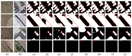 Visual results on WHU-CD. (a) T1 images; (b) T2 images; (c) Ground truth; (d) FC-EF; (e) FC-Siam-Conc; (f) FC-Siam-Diff; (g) IFNet; (h) BIT; (i) DSAMNet; (j) the proposed.