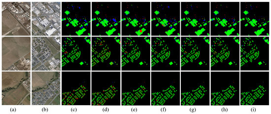 Comparison of Error Maps Based on WHU-CD. (a) T1 images; (b) T2 images; (c) FC-EF; (d) FC-Siam-Conc; (e) FC-Siam-Diff; (f) IFNet; (g) BIT; (h) DSAMNet; (i) the proposed (Black, green: correct detection, red: missed detection, blue: over detection).