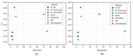 In addition, the computational efficiency of the model is evaluated by comparing the amount of parameter calculation of different models. To better compare the relationship between model complexity and model performance, we report the F1 vs. multiply accumulate operations (MACs) and F1 vs. the number of parameters (Params) trade-offs for the LEVIR-CD test set in Table 3. Among them, MACs can more comprehensively describe computational complexity from a mathematical perspective. It can be seen that our proposed method achieves the highest F1 score (88.1%) with a complexity of 9.15 G MACs and 3.20 M parameters. Figure 10 makes a visual comparison, and our proposed method has the lowest computational cost, which is more efficient than other models. Through the comparison of the above evaluation indicators, the results show that our method has advantages in predicting label edge fineness, false positive rate, and recall rate. At the same time, this model is more lightweight and more efficient. In summary, our proposed method has more model efficiency and accuracy advantages to achieve better change detection effects.